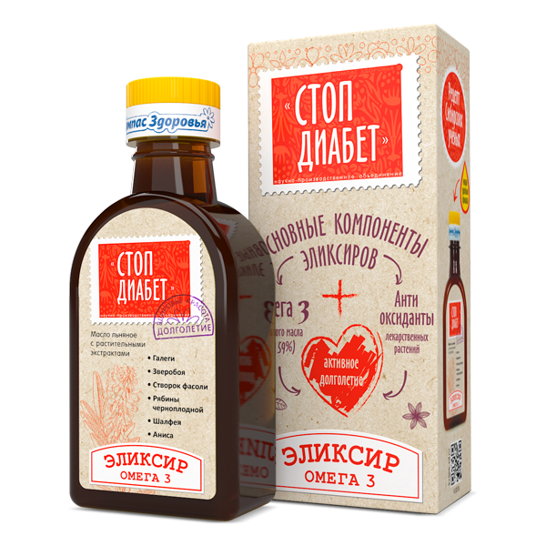 В составе эликсира "Стоп Диабет" масляные и льняные экстракты трав с доказанной сахарорегулирующей активностью: галеги, зверобоя, шалфея, створок фасоли, плодов аниса и черноплодной рябины. Настаивание на льняном масле (оно имеет рекордное содержание ОМЕГА 3 – 57%) позволяет максимально полно извлекать из растений биологически активные соединения, да и сама ОМЕГА 3 "ремонтирует" мембраны клеток, улучшая транспорт глюкозы в клетку.